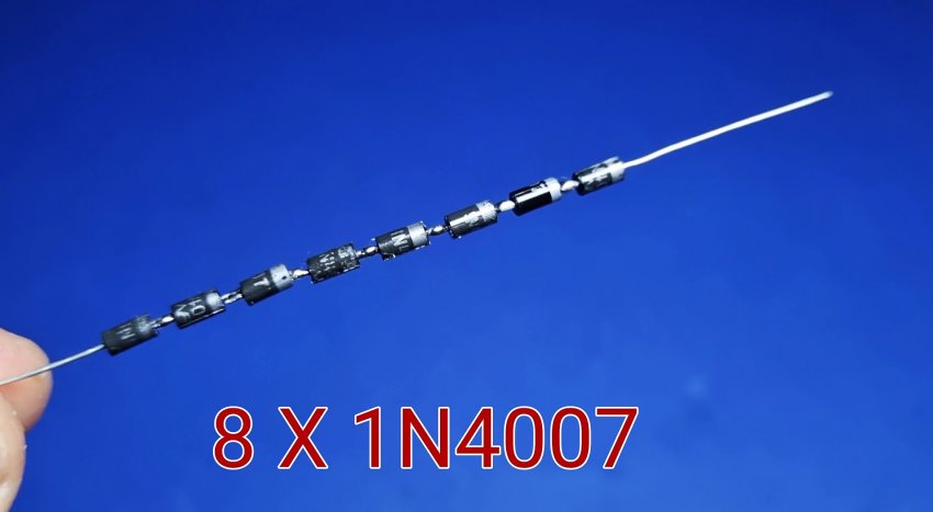 Длинные вывода диодов откусываем и спаиваем их в единую цепь, анод к катоду.
