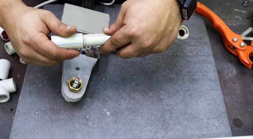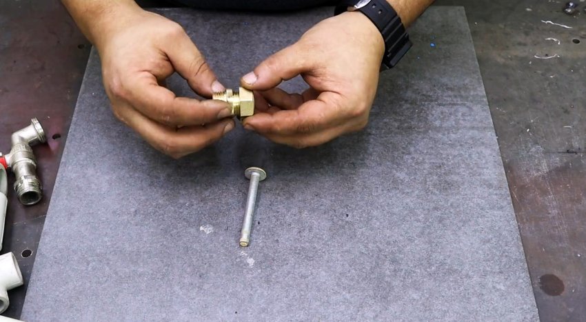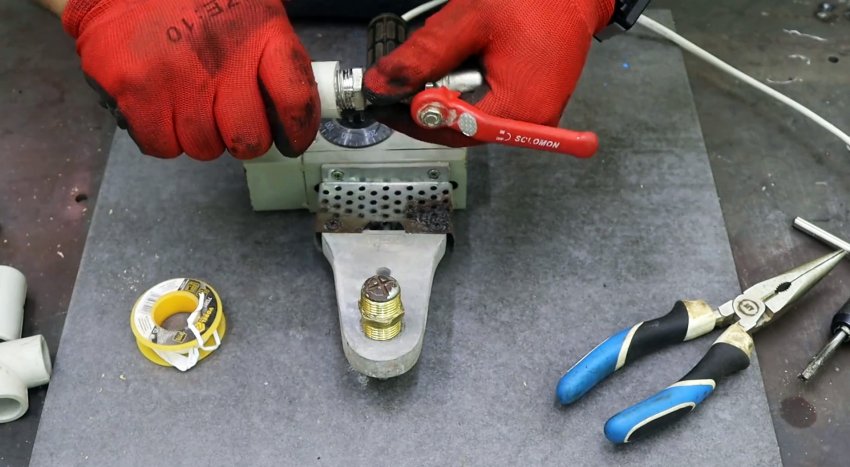 После этого подбирается длинный болт М6 с широкой головкой, которая застревает в ниппели с наружной резьбой. Ниппель и заглушка с помощью болта устанавливаются на паяльник для ПП труб вместо стандартной оснастки.