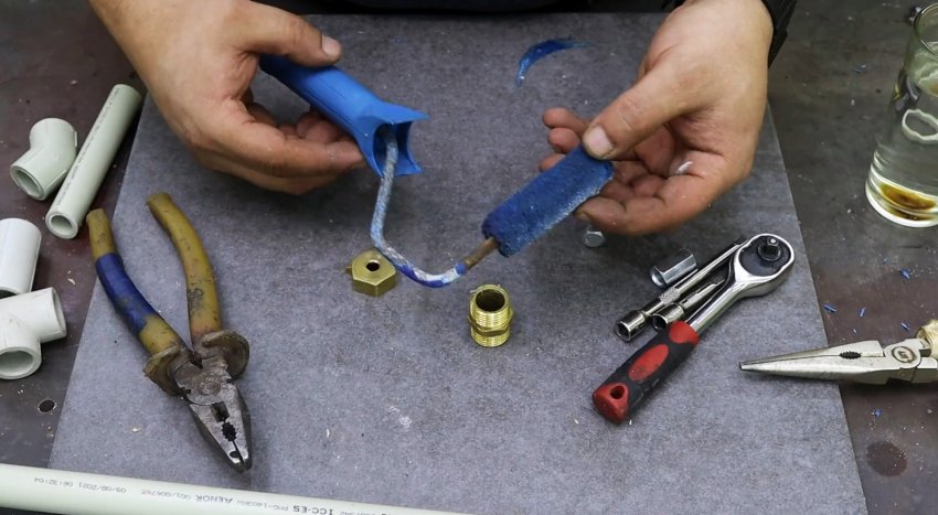Если у вас нет электрического паяльника, тогда сделанная оснастка закрепляется на ручку. В ее качестве послужит рукоятка от малярного валика. В нее нужно закрутить шпилька М6, и наживки на конце удлиненную гайку.