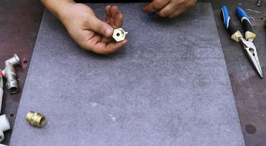 В этом случае сначала делается наружная или внутренняя резьба, а затем насадка переставляется и выплавляется ответная часть. Причем заглушка устанавливается на постоянной основе, а ниппель при необходимости вкручивается в нее.