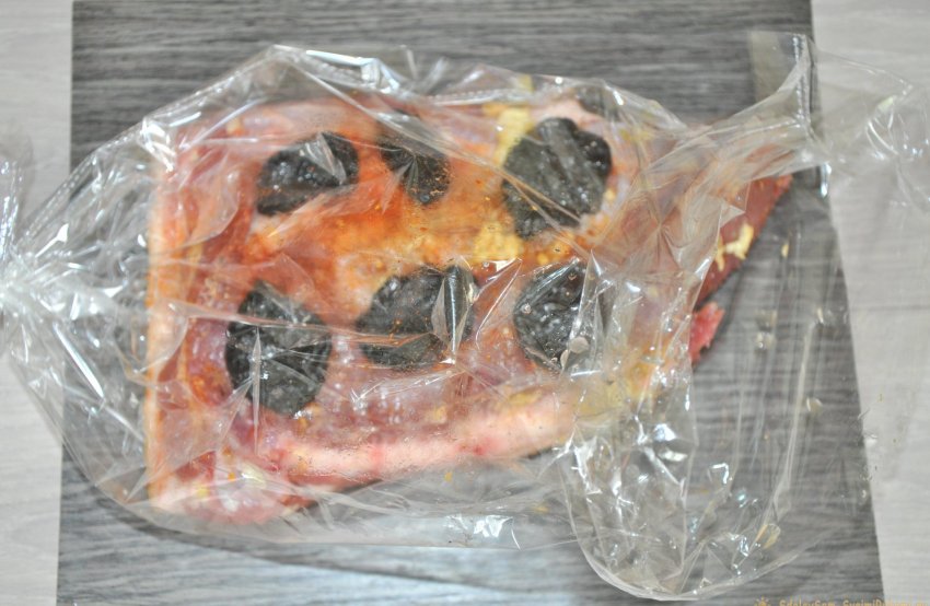 3. Замаринованное сало положите в рукав для запекания (шкуркой вниз), одним рядом сверху на него выложите помытый чернослив.
