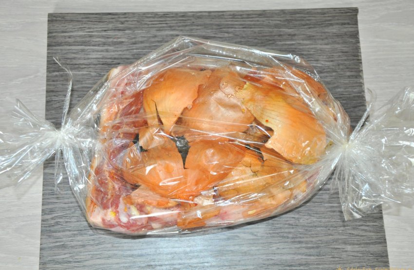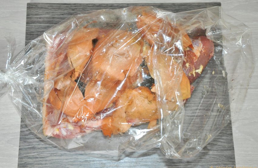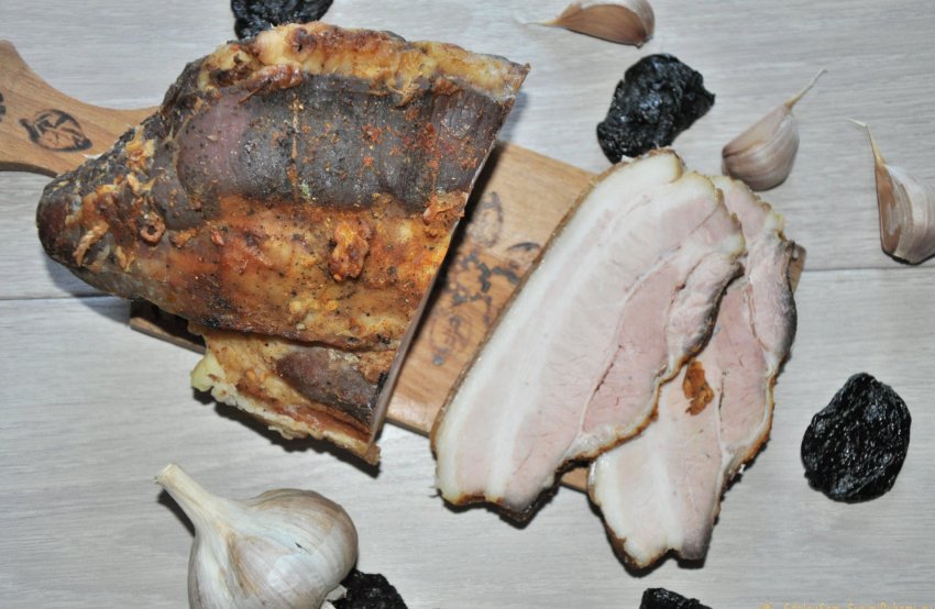 5. Рукав плотно завяжите, положите на противень и поставьте запекаться. Запекать будущее копченое сало с черносливом следует при температуре 200 градусов в течение 1 – 1,5 часа (в зависимости от наличия конвекции в духовке).