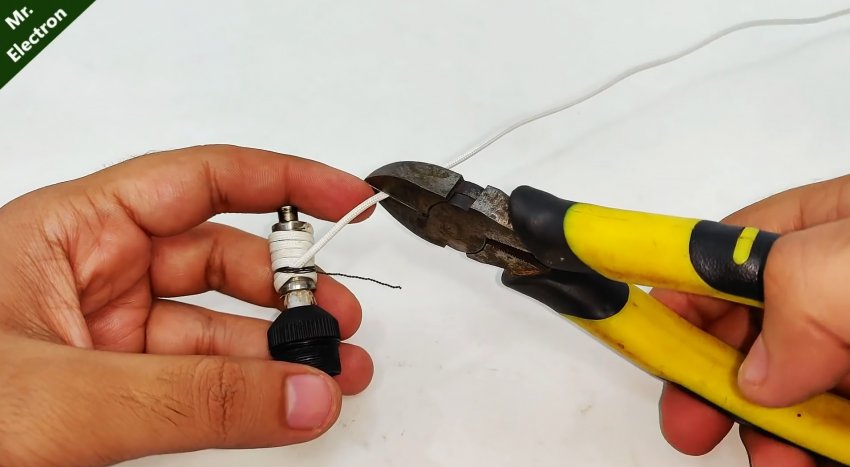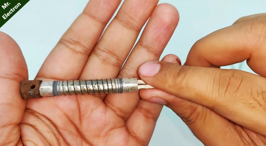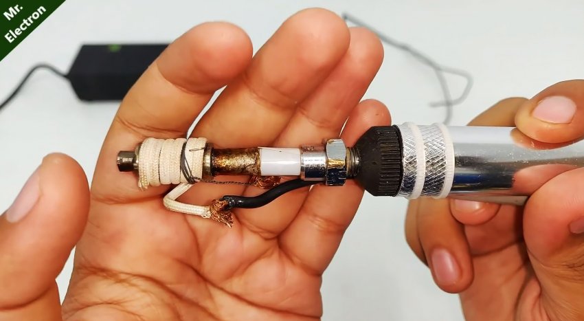 Намотанная нагревательная нить скручивается с проводами от источника питания на 12 В. Сами провода можно закрепить на оловоотсосе стяжками. Теперь если подать напряжение, то наконечник разогреется. Прислонив его к ножке детали на микросхеме мы расплавляем припой, а нажав на кнопку поршня ручного оловоотсоса убираем олово.