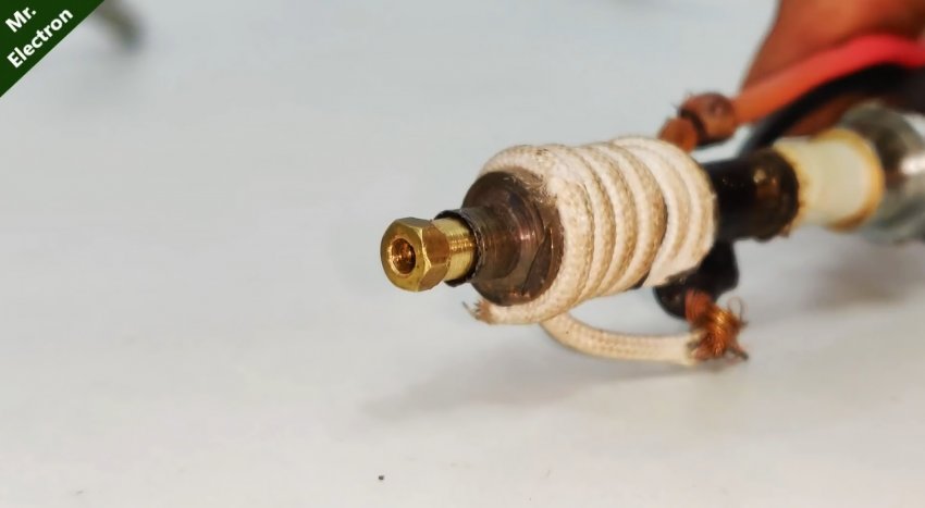 Затем надеваем на сопло теплоизоляционный высокотемпературный рукав, и сверху натягиваем наконечник. После этого нужно намотать на наконечник нихромовую проволоку, помещенную в температуростойкую изоляцию. Закрепить ее в начале обмотки можно обычной жаростойкой проволокой.