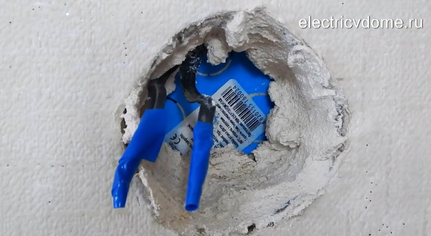 И теперь устанавливаем подрозетник в посадочное место, просунув провода. Стакан должен утонуть в гнезде заподлицо со стеной, выступ не допускается.