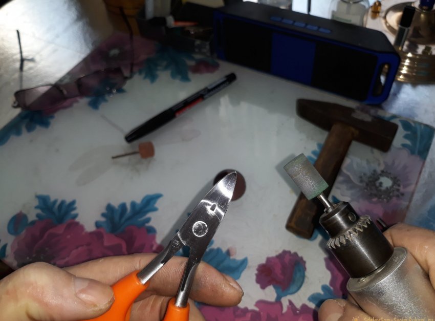 И это оказывается фатальной ошибкой, после которой многострадальному инструменту только одна дорога – в мусорную корзину! Кусачки следует затачивать именно с наружной стороны, где режущие кромки смыкаются. Устанавливаем шлифовальную шарошку с крупной зернистостью на гравер или дрель, смыкаем кусачки, и плавными движениями, со стороны втулки в сторону кончика, выравниваем поверхность, пока сомкнутые половинки не окажутся на одном уровне.