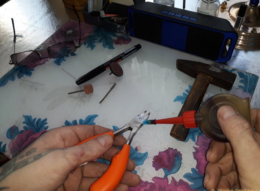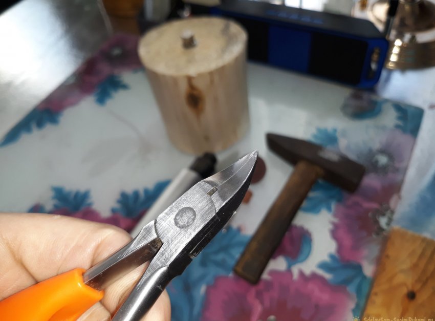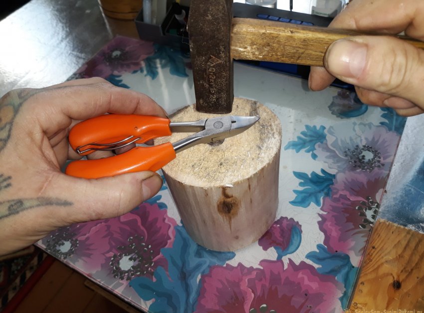 Для этого нужно расширить разболтавшуюся со временем втулку, соединяющую две половины инструмента. Расширять втулку мы будем путем ее вертикального легкого расплющивания. В качестве наковаленки можно использовать второй молоток, топорик, или просто вбитый в отрезок полена небольшой металлический штырь с плоским торцом. Итак, кладем кусачки на наковаленку, втулкой на самое выпуклое место, и сверху по втулке наносим молоточком несильные удары.