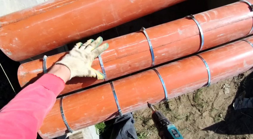Фиксируем опалубку, чтобы ее не расперло бетоном. Для этого была испробована вязальная проволока, монтажная лента на болтах, а также их комбинация. Все эти варианты оказались трудоемкими и не очень надежными. Наиболее простым и надежным способом крепления опалубки оказались хомуты, которые устанавливались на трубе с шагом в среднем 20 см.