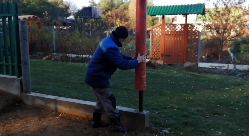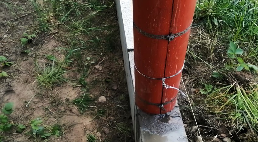 Наличие продольного разреза позволяет раскрыть опалубку для того, чтобы снять ее со столба. Изнутри промазываем трубу отработкой, чтобы бетон не прилипал к стенкам трубы и легче снимался с нее.