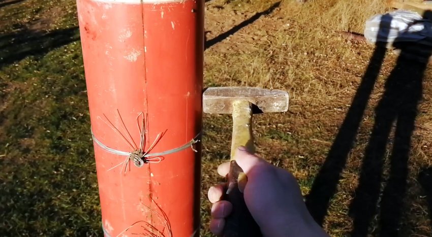Набив полностью трубу бетоном, начинаем его трамбовать с помощью ударов молотка по наружной поверхности опалубки. При этом видно, как усаживается бетон в трубе, а через щели между ее половинками начинает просачиваться вода.