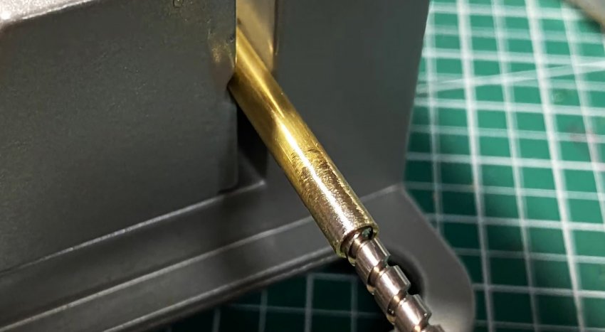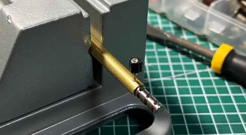 Далее по размеру червяка с запасом обрезаем латунную трубку. В одном конце делаем боковое отверстие 0,6 мм в диаметре.