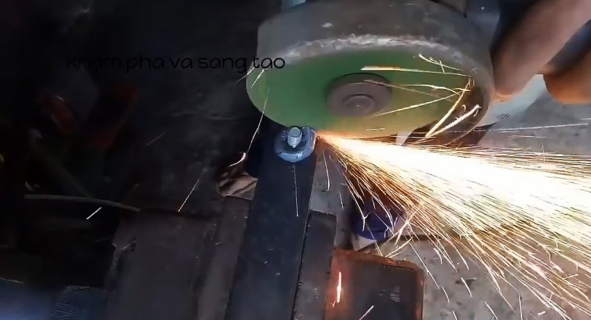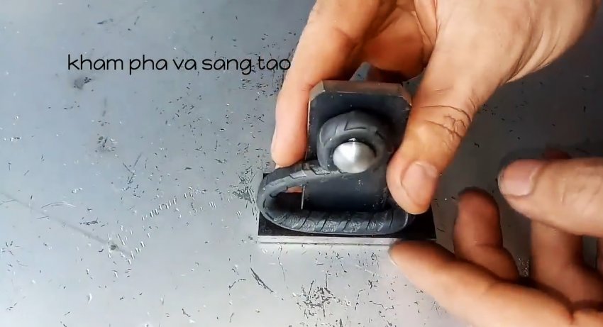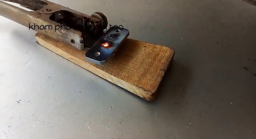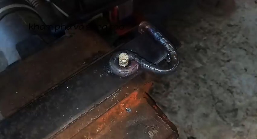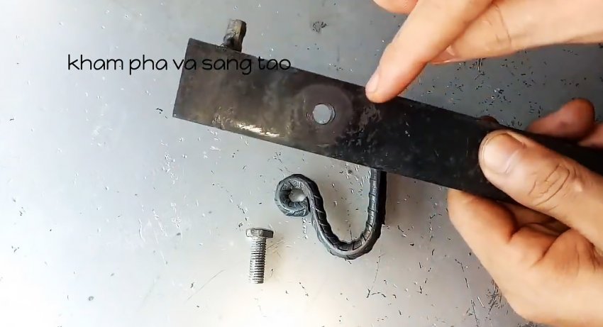 К заготовке приваривается крепление из отрезка полосы с отверстиями по краям. Важно, чтобы расстояние от края скобы до крепления на пару миллиметров превосходило толщину имеющейся полосы. Также вваривается обточенный болт, но так, чтобы скоба могла свободно поворачиваться.