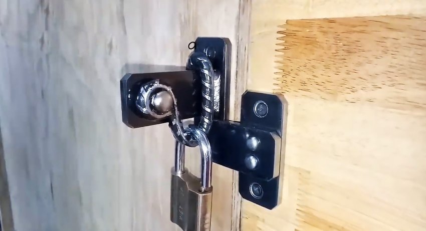 При закрывании скоба сама поднимается, и затем падает, блокируя штифт. Открыть дверь можно приподняв ее. Изгиб внизу на скобе позволяет цеплять навесной замок, полностью блокируя механизм.