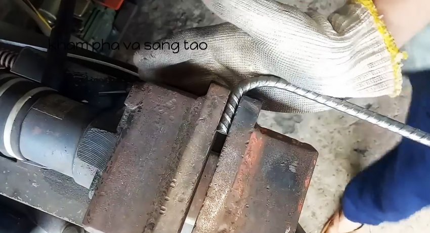 Полученный перегиб нужно сузить. Для этого он дожимается тисками. Между арматурой вкладывается полоса, чтобы сохранить на перегибе небольшой зазор.