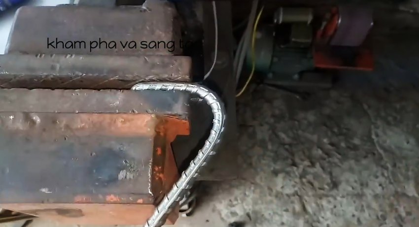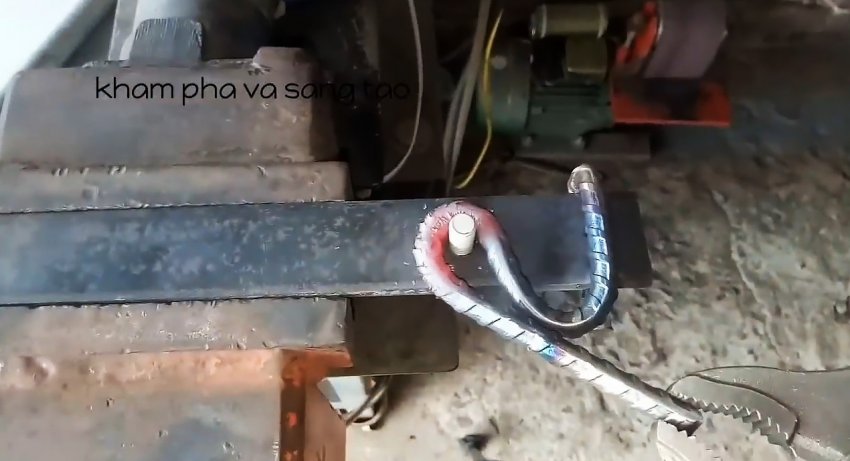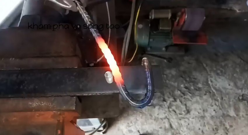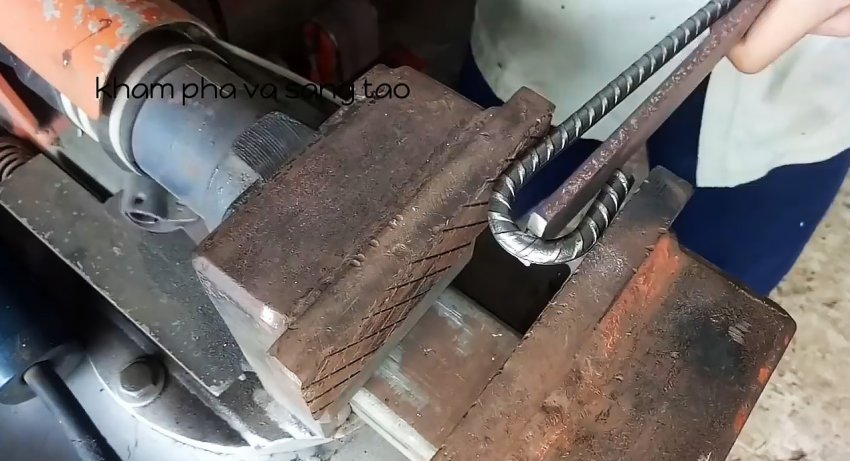 Далее нужно накрутить петлю на длинном конце арматуры напротив первого изгиба. Здесь уже металл потребуется разогреть. Изгиб выполняется вокруг болта М10, вставленного в отверстие в полосе. Лишняя длина арматуры отрезается, нужно сформировать проушину.