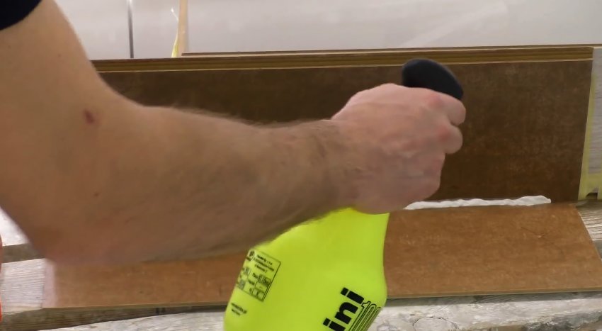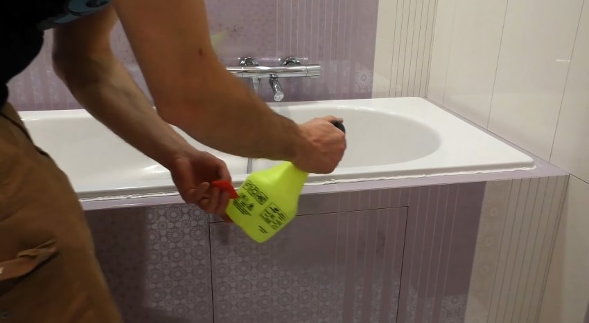 На силикон распыляется мыльный раствор. Он смочит открытие прилегающие поверхности, и не позволит при снятии излишков герметику липнуть. Важно не набрызгать на край шва, если тот не закончен, и поверхности, где силикон еще будет наноситься.