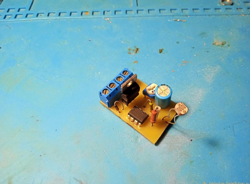На плате я решил разместить лишь стабилизатор напряжения 7805 (его использование не обязательно, да и можно заменить на другие 78xx) и сам датчик, который включает в себя микросхему lm358 (операционный усилитель в режиме компаратора), фоторезистор, подстроечный резистор и обвязку для них. Блок питания и реле с транзистором я спаял отдельно навесным монтажом. В конце статьи будет архив с платой и схемой.