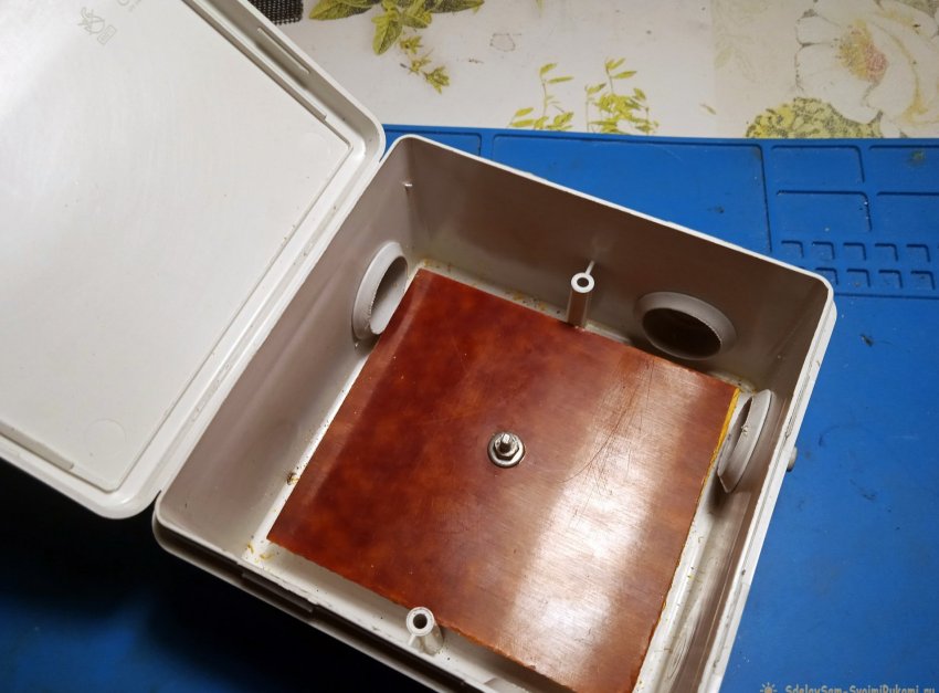 В Леруа купил распределительную коробку. На дне были стойки, которые мешали креплению элементов. Поэтому я взял кусок гетинакса и закрепил его ко дну коробки.