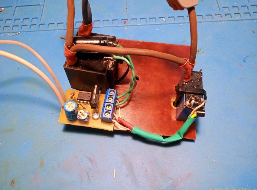 Блок питания выполнен на корпусном трансформаторе с выходным напряжение 11 Вольт, диодном мосте в корпусе и конденсаторе.