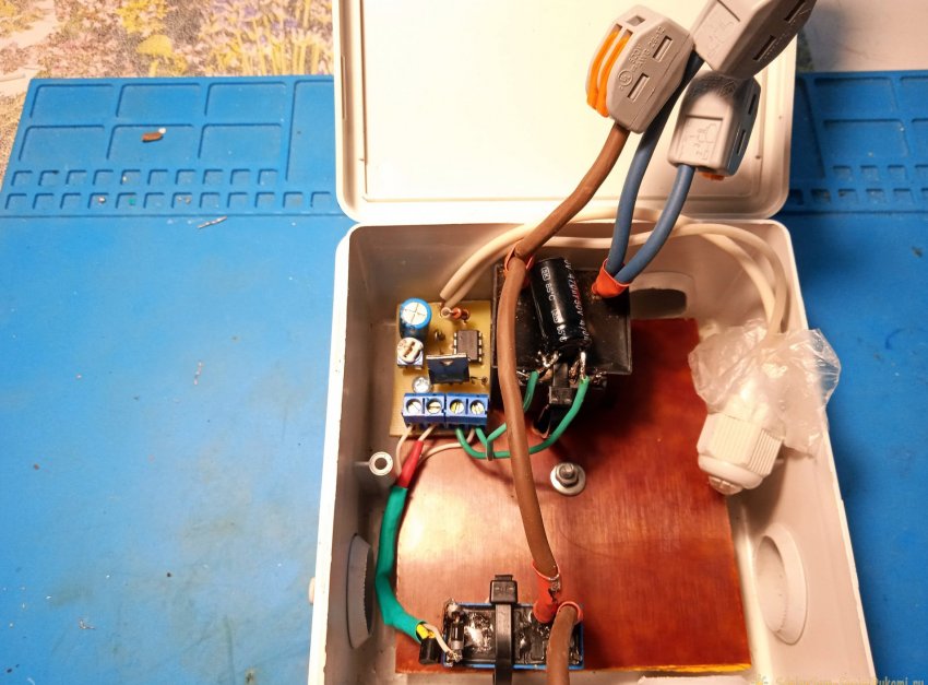 Плату с датчиком закрепил на одном винте, а блок питания с реле закрепил на стяжках. Для удобного подключения питания и управляемой нагрузки я купил разъёмы Wago.