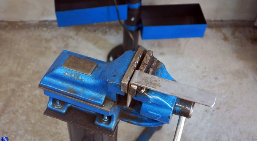 Закрепляем пластину вертикально в тиски на уровне вторых меток и сгибаем ее с помощью ударов молотка на 90 градусов.