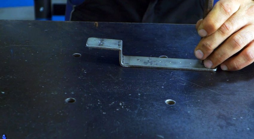 По намеченной поперечной линии выполняем болгаркой неглубокую прорезь и сгибаем пластину еще раз на 90 градусов так, чтобы согнутый край был параллелен оставшейся части, но лежал в другой плоскости.