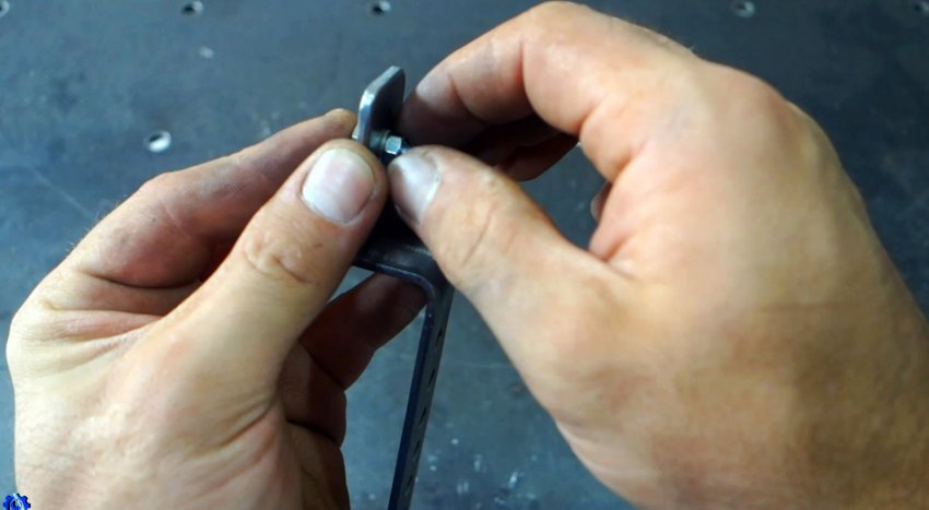 Прижимаем платину длиной частью к поверхности верстака и вставляем сверху в отверстие короткой части винт с шайбой. С обратной стороны на винт надеваем шайбу, накручиваем гайку, накрываем ее шайбой и наворачиваем на конец винта ступицу магнитного диска.