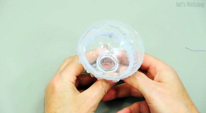 На бутылки накладываются бумажные салфетки в несколько слоев. Сверху они фиксируются стягивающим чехлом из тюля.