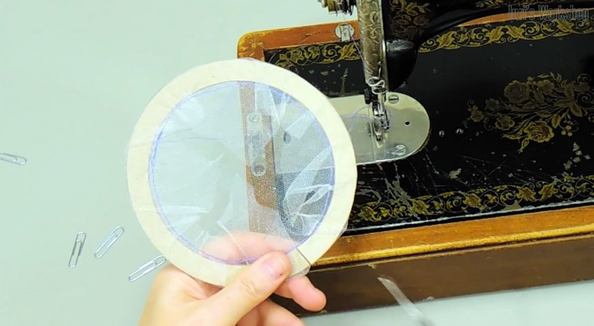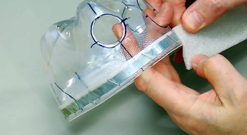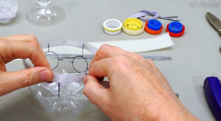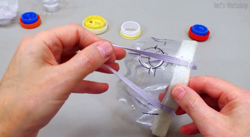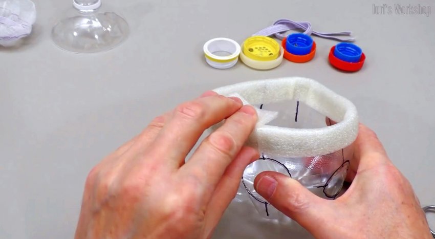 По ободку, снаружи и изнутри, приклеивается двусторонний скотч. На него клеится с загибом пенополиэтиленовая лента. Сразу же фиксируется степлером резинка для ношения респиратора.