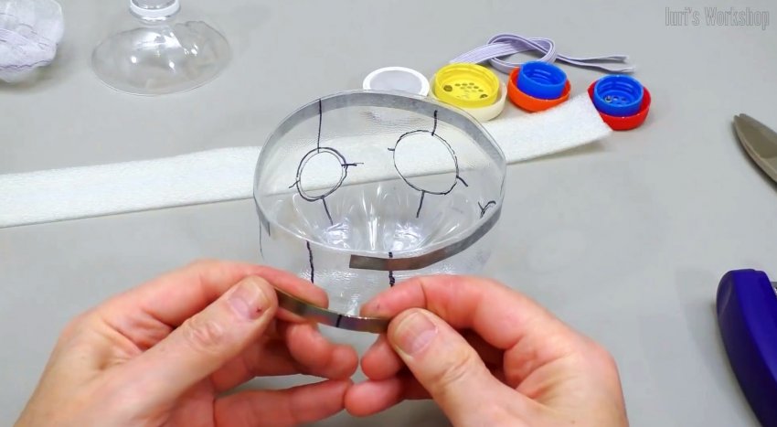 Ободок донышка нужно обернуть металлической лентой, и зафиксировать ее степлером. Поначалу ленту можно приклеить двусторонним скотчем. Лента позволяет придать донышку форму лица, обеспечив прилегания к переносице.