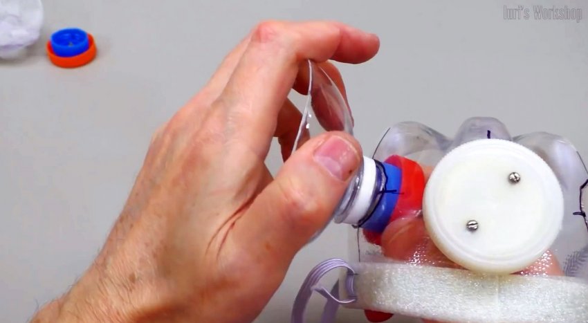 В большое центральное отверстие респиратора изнутри вставляется спиленная резьба горловины бутылки со средней крышкой. Снаружи на нее наворачивается большой клапан.