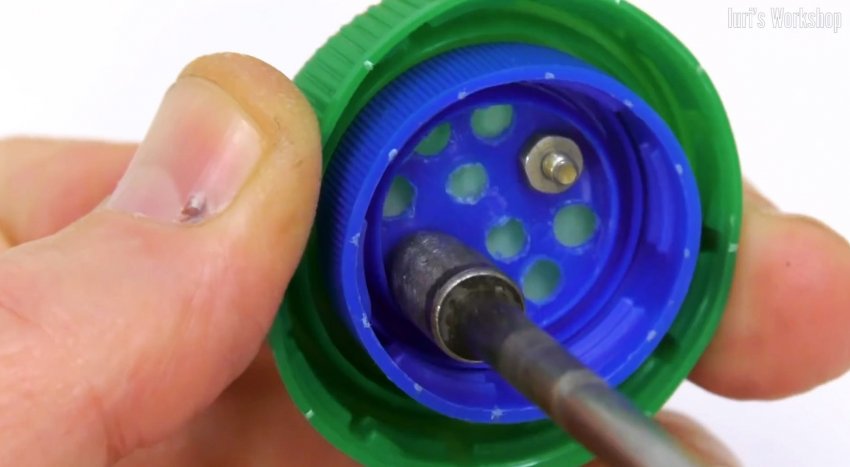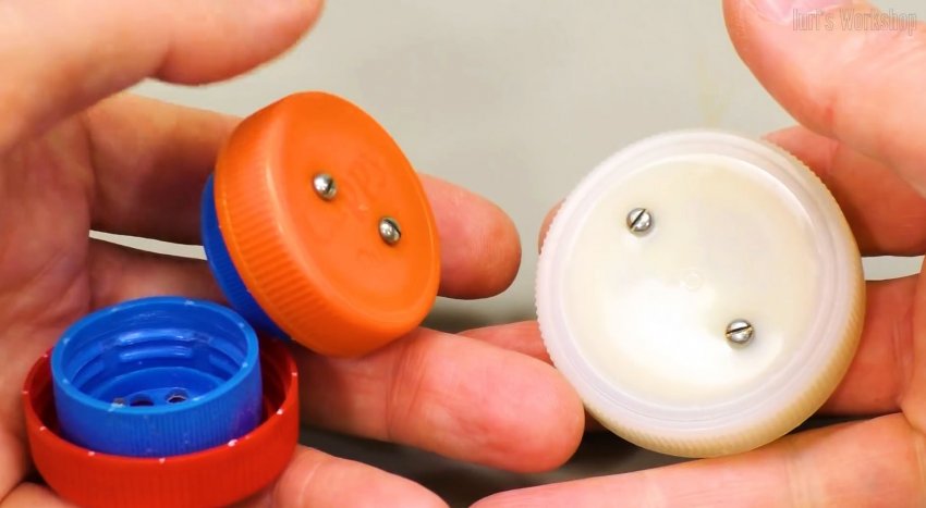 Затем маленькие просверленные крышки прикладываются к средним. Нужно пометить на последних 2 отверстия под винты. Аналогично делается со средней перфорированной крышкой и большой от бутыли.