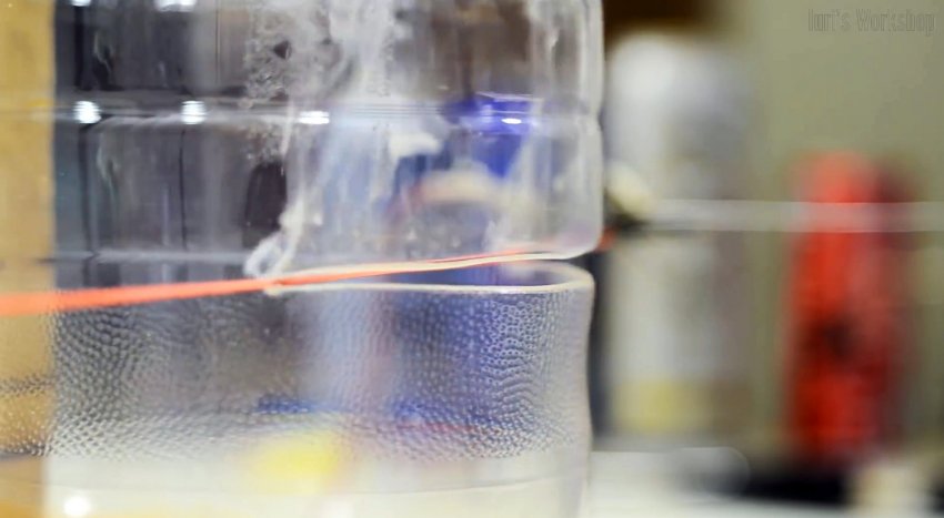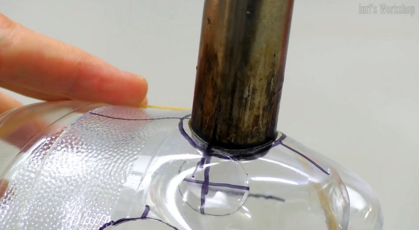 У 3-литровой ПЭТ бутылки отрезается дно. В нем проплавляются или прорезаются отверстия для установки клапанов.