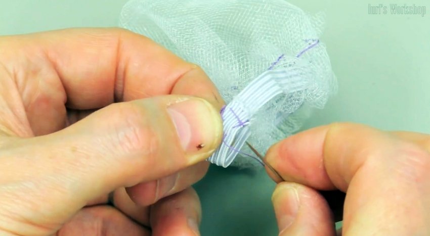 Тоже потребуется заготовить 2 горлышка от бутылок под обычную пробку. Под них нужно сшить из тюля по чехлу со стягивающей резинкой.