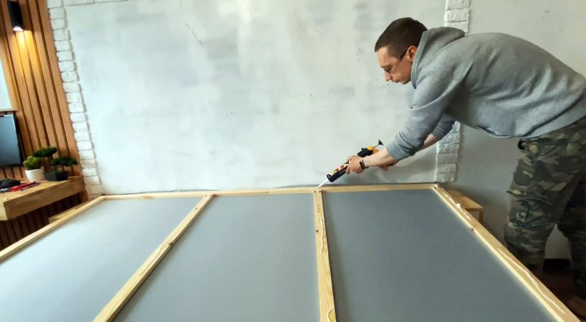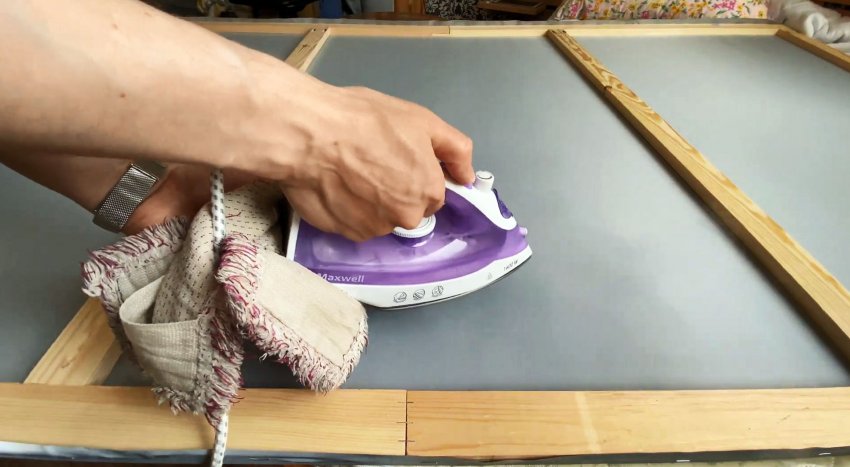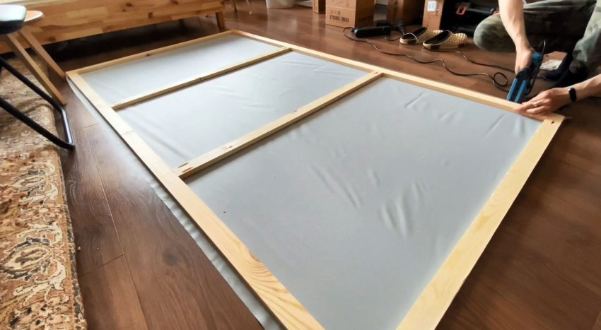Ткань прибивается степлером на рамку. Она подворачивается, и скобы вбиваются на обратной стороне реек.
