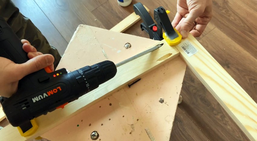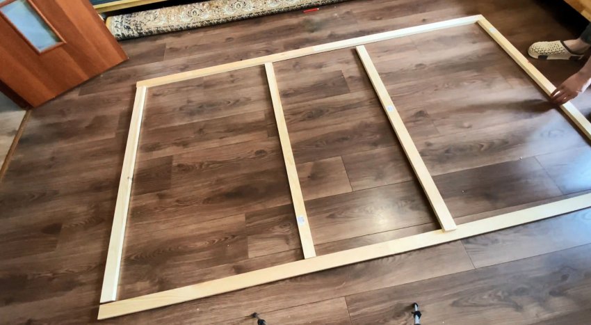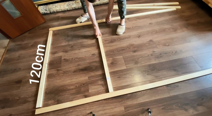 Отталкиваясь от сделанных меток, нужно изготовить рамку экрана из рейки. В данном случае делается 100 дюймов экран со сторонами 120х220 см. Для жесткости понадобится сделать на рамке несколько перемычек. Соединять рейки можно любым удобным способом. Дешевле всего это делать на клей и косой шуруп, если имеется такой кондуктор. Можно также использовать металлические монтажные уголки.