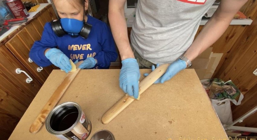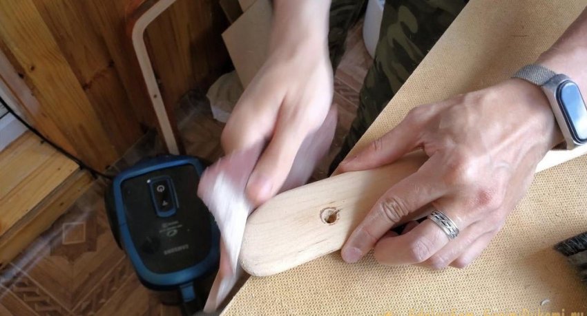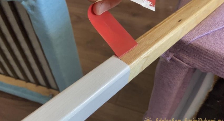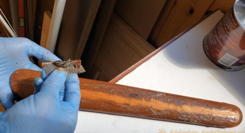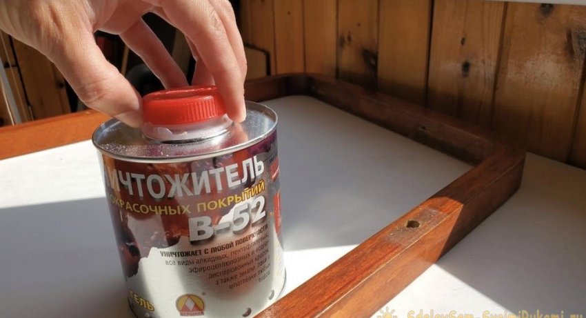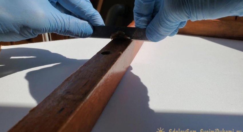 Мне не нравился цвет ножек, поэтому я решила удалить старый лак. Я использовала средство для удаления краски B52. Нанёс его на дерево, подождал около 10 минут и соскреб ножом. После высыхания, отшлифовал наждачной бумагой.