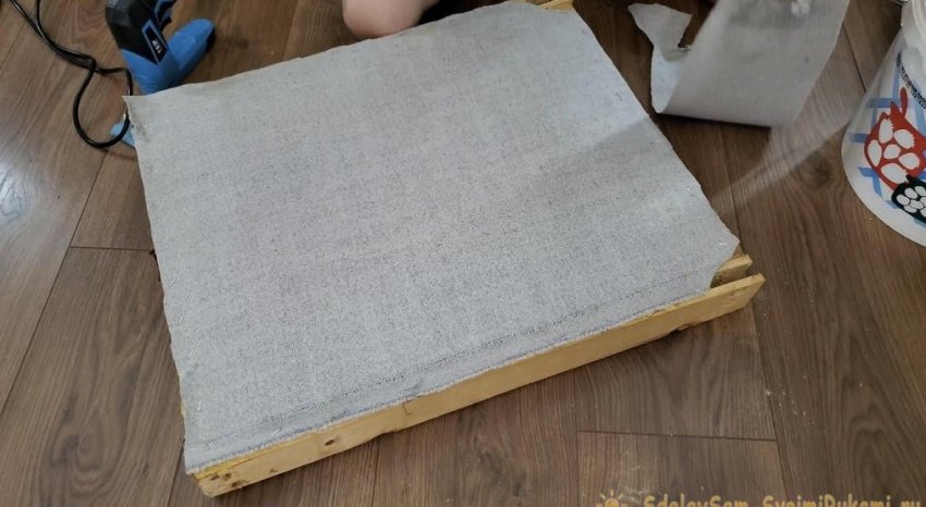 Ткань фиксирую степлером. Очень важна степень натяжки! Она должна быть равномерной, иначе на выходе получатся не симметричные стороны. Углы фиксирую в самом конце. Излишки ткани аккуратно подрезаю ножницами.