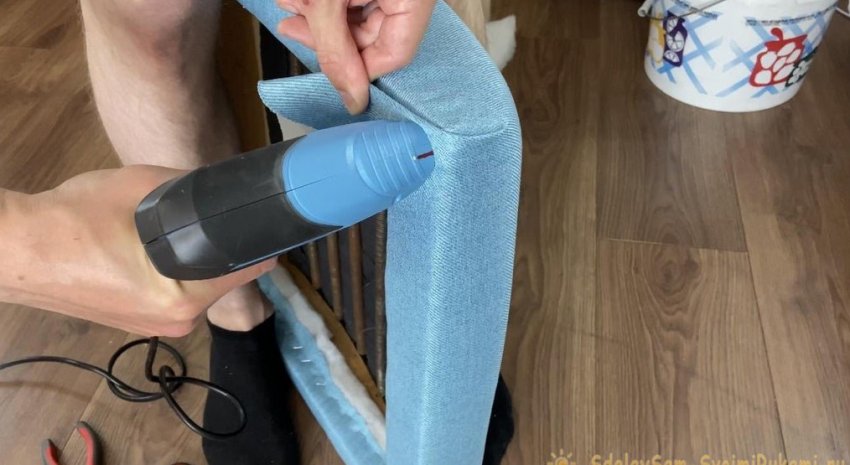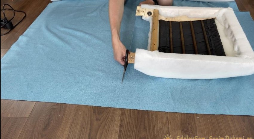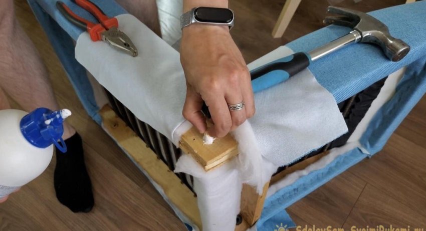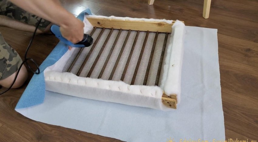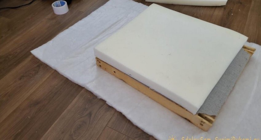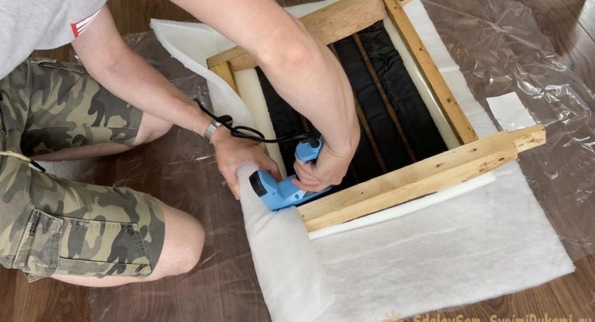 Далее идет стой синтепона. Синтепон позволяет сгладить углы поролона и добавляет дополнительную мягкость сиденью. Синтепон фиксирую так же при помощи степлера.