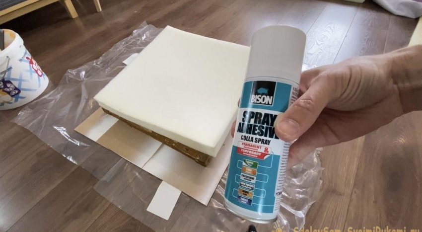 Для обивки использовал поролон толщиной 5 см. Поролон фиксировал при помощи аэрозольного клея.