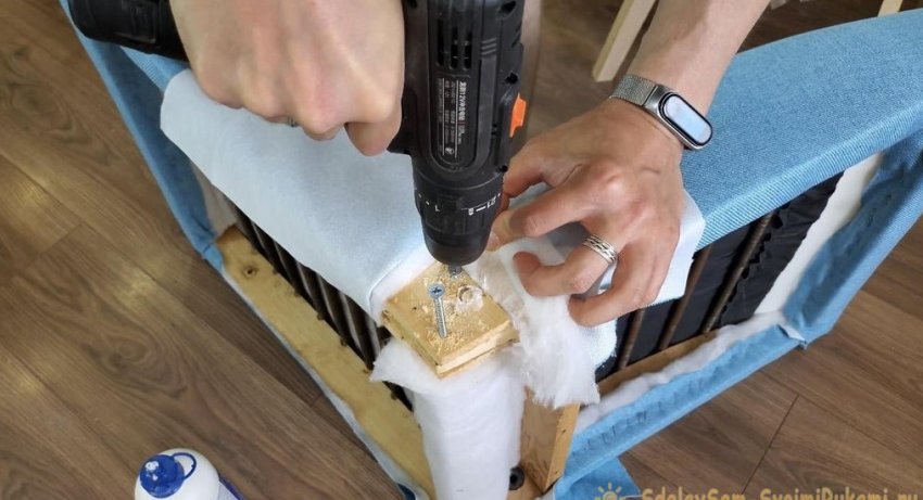Спинка и основание кресла готовы. Теперь их нужно обратно соединить. Для большей надежности вкрутил пару саморезов.