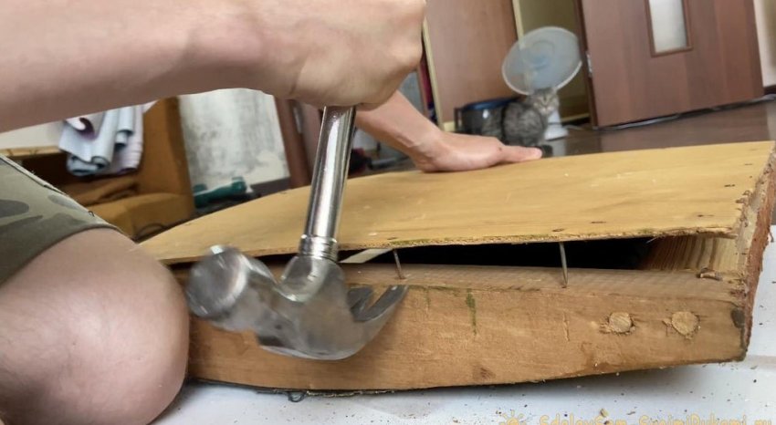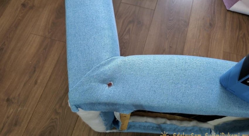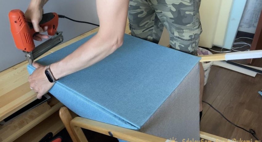 Старую фанеру со спинки кресла я заменил на новую. Для обивки я вырезал кусок ткани чуть большей по размеру чем спинка кресла. Затем нанес на нее аэрозольный клей и приклеил ткань. Спинку фиксировал нейлером при помощи мелких гвоздиков.