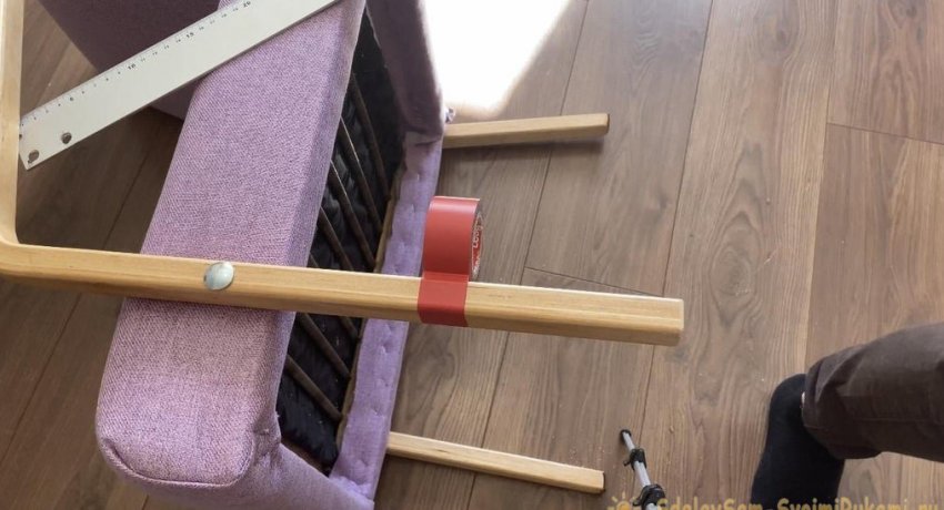Что бы спрятать пружины, низ кресла обтянул мешковиной.