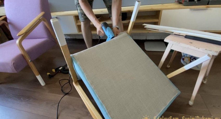 Пружины у кресла еще в хорошем состоянии, поэтому решил их сохранить. Пружины накрыл куском плотной мешковины. Для этого вырезал примерно в размер сидения кусок ткани и прикрепил его при помощи мебельного степлера. Мешковина нужна для защиты поролона. Без нее поролон быстро износится о пружины.