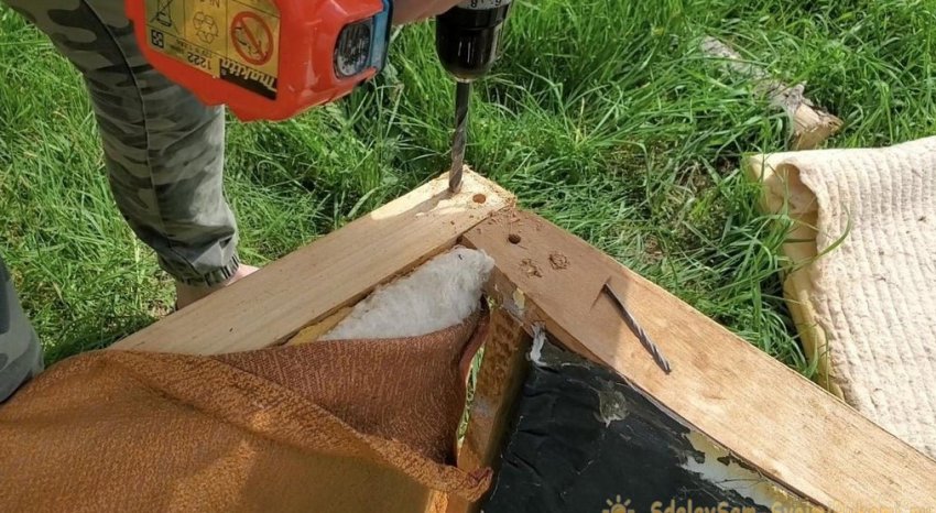 Старые, ржавые винты заменил на новые. В ткани сделал отверстие для винтов что бы ткань не «расползлась», зафиксировал ее скобами.