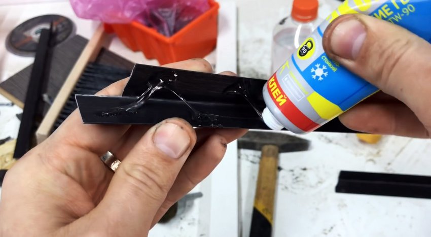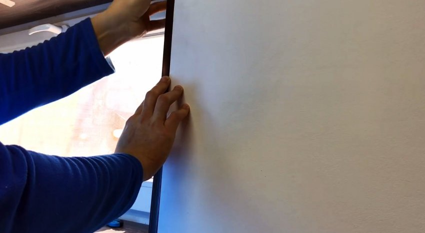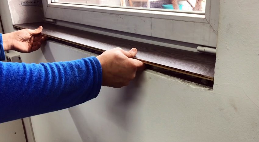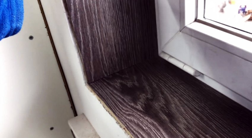 Далее нужно приклеить ламинат сверху. Для этого со стороны рамы его требуется на что-то уложить. В данном случае створка открывается по горизонтали, поэтому удалось опереться на подкладки, уложенные прямо на нее. В обычном же случае можно временно приклеить двусторонним скотчем на раму окна дощечки или рейку, чтобы опереть на них ламинат.