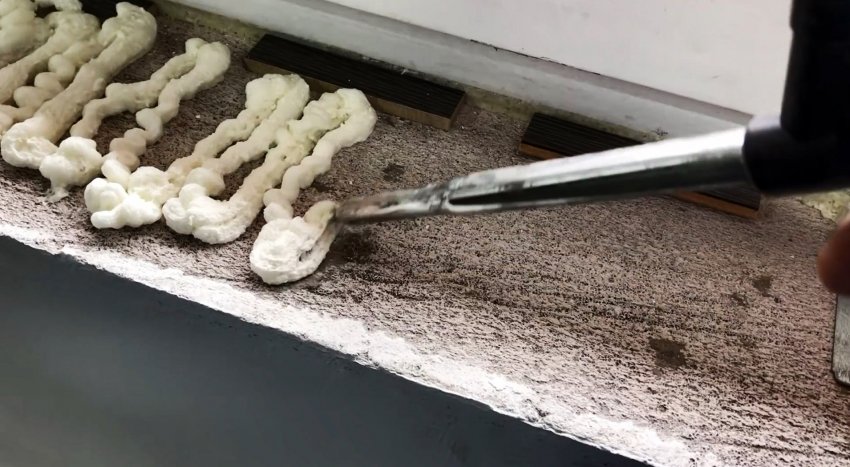 После этого наносится монтажная пена, и подоконник укладывается. Сверху его необходимо прижать любым грузом пока пена не схватится.