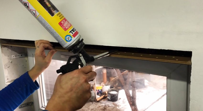 Пена задувается только возле рамы, где наибольший зазор. Со стороны стены она прикладывается к проему вплотную, и фиксируется малярным скотчем с шагом 15-20 см.