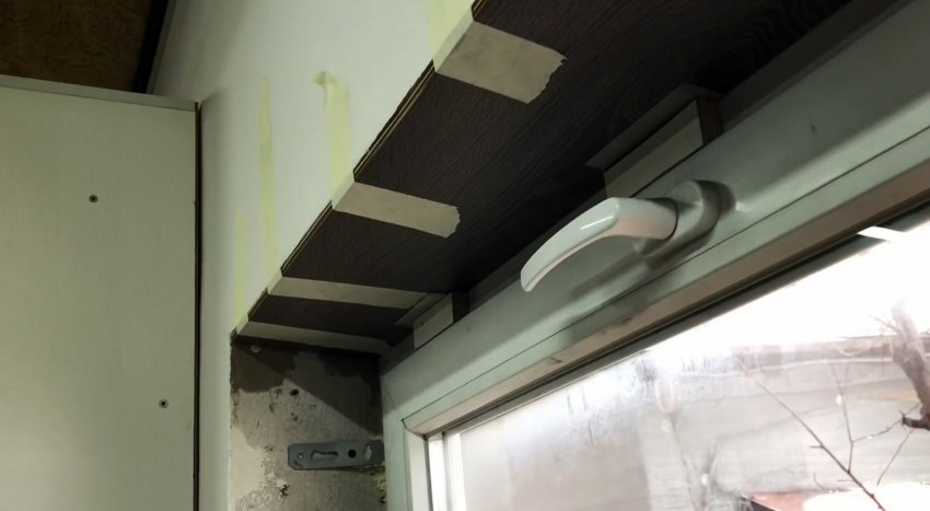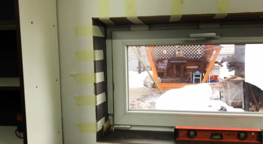 Боковые стенки откосов приклеивать уже намного проще. Достаточно их просто зафиксировать малярной лентой. Если черновые откосы кривые, и на отдельных участках пришлось наносить больше пены, то чтобы их не выгнуло, можно распереть боковины рейками.