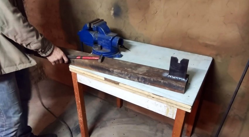 Одну из заготовок двухсторонним швом приваривают перпендикулярно к стенке в торце металлического швеллера.